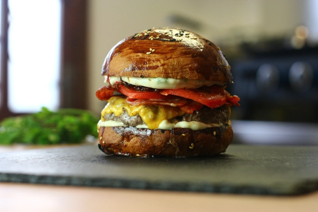 Hovězí podplečí, sýr provolone, křupavá slanina, volí oko, pickles, slaninová mayo