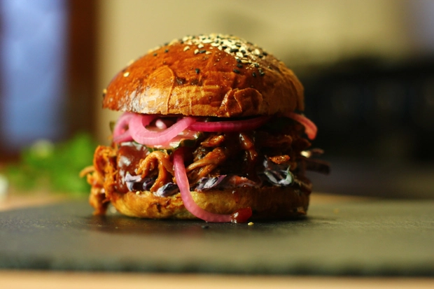 Trhané vepřové žebro, fialový coleslaw, chipotle BBQ, pickles z okurky a červené cibule